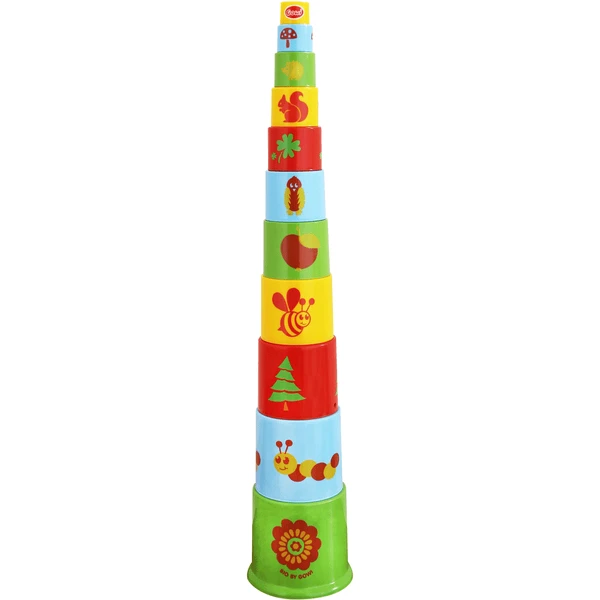 - Die BIO by GOWI Pyramide Wald beinhaltet 11 bunte Stapelbecher, die mit verschiedenen Naturmotiven bedruckt sind